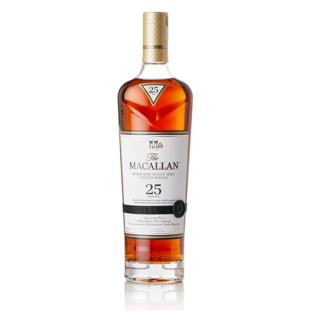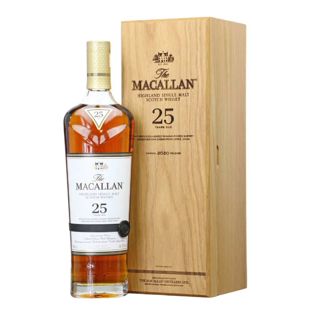 Delve into the exquisite world of Macallan Sherry Oak 25 Years Old 2020 Release, a remarkable single malt that epitomizes the pinnacle of whisky craftsmanship. This distinguished expression from Macallan, one of the most revered names in the world of Scotch whisky, offers an unparalleled tasting journey, matured exclusively in hand-picked sherry seasoned oak casks from Jerez, Spain. The 2020 release is a testament to Macallan’s unwavering dedication to quality, tradition, and the art of whisky making, presenting a luxurious experience for connoisseurs and collectors alike.
